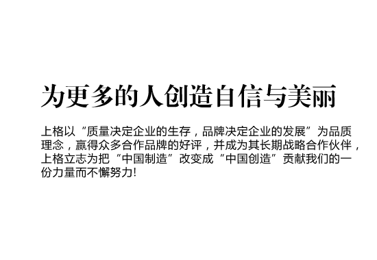 上格一路走來,以“締造時尚集團,使公司受人尊敬,令人向往;為客戶提升價值,創造成功;讓員工提高生活品質,實現自我價值”作為我們的目標,“為更多的創造自信與美麗” 作為我們的使命,立志為把“中國制造” 改變成“中國創造”貢獻我們的一份力量而不懈努力!